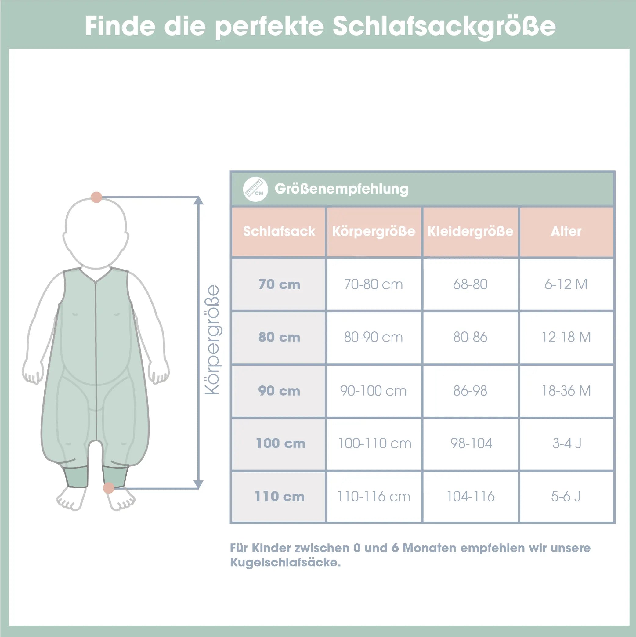 Unsere Schlafsäcke sind eine beliebte und sichere Alternative zu klassischen Babydecken und begleiten Dein Kind von Geburt an. Dank verschiedener Größen kannst Du zwischen Kugelschlafsäcken sowie Schlafsäcken mit Füßen bis Größe 110 cm wählen. So findest Du immer die passende Größe – ob für Neugeborene oder Kleinkinder bis ca. 5 Jahre. Damit Dein Baby sicher schläft und nicht in den Schlafsack hineinrutscht, ist die Wahl der richtigen Größe besonders wichtig. Eine einfache Faustregel lautet: Das Baby wächst aus dem Schlafsack heraus – nicht hinein. Unsere praktischen Größentabellen auf den jeweiligen Produktseiten helfen Dir dabei, die optimale Größe schnell und einfach zu ermitteln.