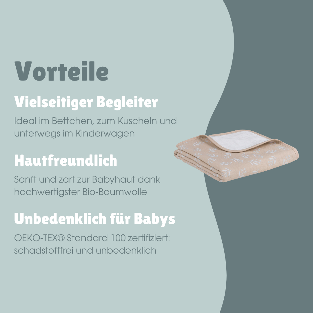 Unsere Babydecken sind die idealen Begleiter für den Familienalltag. Ob als Kuscheldecke, Spieldecke oder Picknickdecke im Garten – dank ihrer hochwertigen Verarbeitung aus Bio-Baumwolle sind sie robust, langlebig und für jede Situation geeignet. Auch unterwegs, etwa im Kinderwagen, bieten sie Deinem Baby Geborgenheit. Und wenn die Decke mal schmutzig wird, lässt sie sich unkompliziert in der Waschmaschine reinigen und ist schnell wieder einsatzbereit.