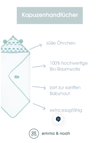 Unsere Kapuzenhandtücher bestehen alleaus 100% ökologischer Bio-Baumwolle, die zu einem extrem saugfähigen Frottee Stoffverarbeitet wurde. Frottee ist ein besonders dicker und saugstarker Stoff, der bei Handtüchern sehr beliebt ist. Außerdem wurde nur die Beste Baumwolle für die Produktion unserer Handtücher verwendet. Dadurch sind die emma & noah Kapuzenhandtücher ganz besonders kuschelig weich und flauschig, damit sich Dein Baby nach dem Bad sofort gut aufgehoben fühlt. Die kuschelig warme Kapuze hält dabei das kleine Köpfchen Deines Babys ganz besonders warm und sorgt für ganz tolle Wohlfühlmomente. Durch die praktische und großzügige Größe von 80x80 cmist Dein Baby ganz schnell eingewickelt und trocken. Wie auch alle andere Produkte von emma & noah, sind auch unsere Kapuzenhandtücher schadstofffrei und unbedenklich für Babys und Kleinkinder. Das garantiert das OEKO TEX Standard 100 Siegel, mit welchem wir zertifiziert sind. Außerdem werden auch alle unsere Produkte vegan produziert. Das hochwertige Material aus Baumwolle kann übrigens auch problemlos in einer herkömmlichen Waschmaschine bei 40°C gewaschen werden. Nach der Wäsche kann das Baby Kapuzenhandtuch auch problemlos in einen Trockner getan und gebügelt werden. Durch die hochwertige und moderne Verpackung eignen sich unsere Kapuzenhandtücher übrigens auch ganz hervorragend als tolles Geschenk für eine Babyparty oder einen Geburtstag, das alle Babys lieben werden!
