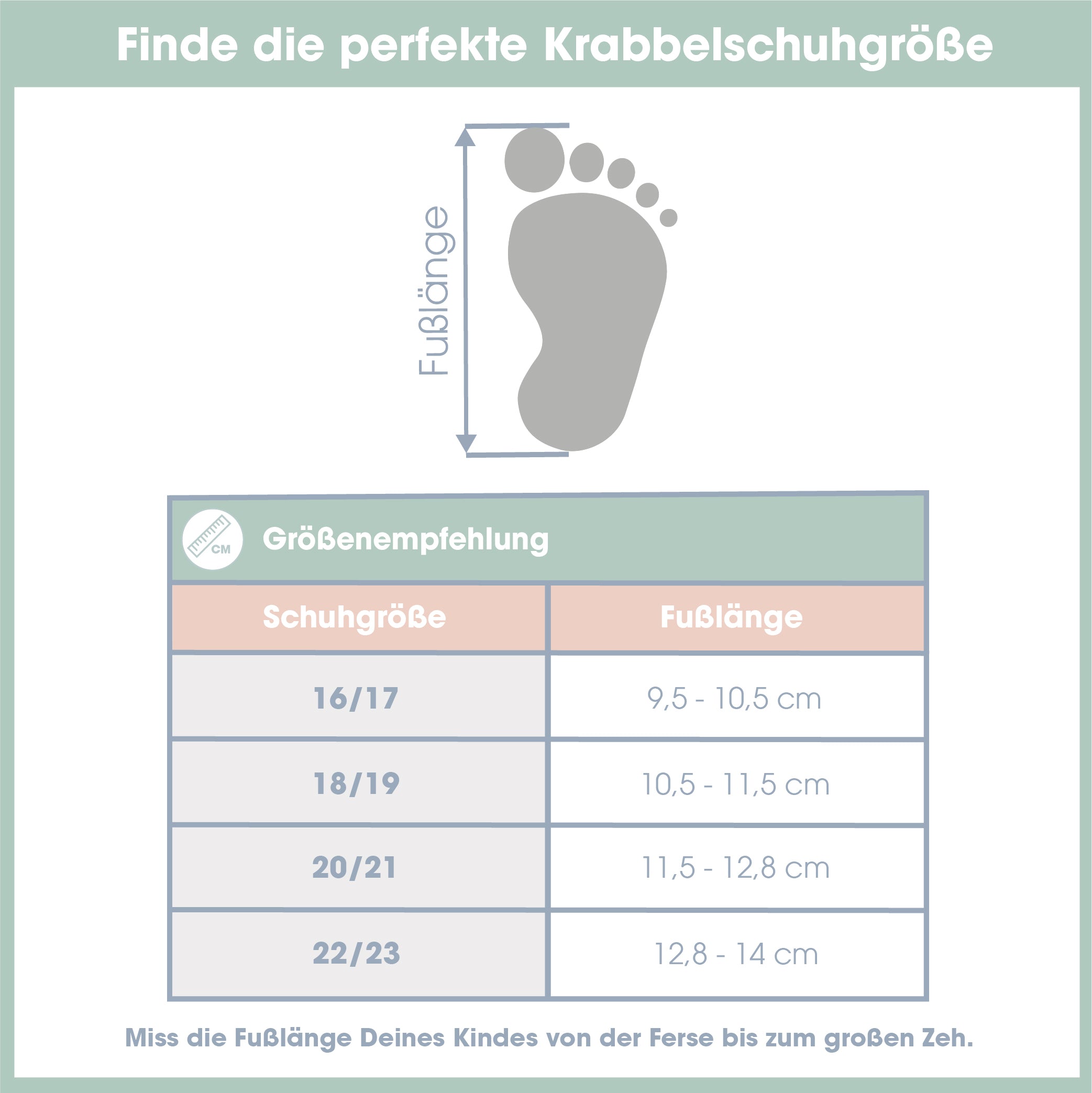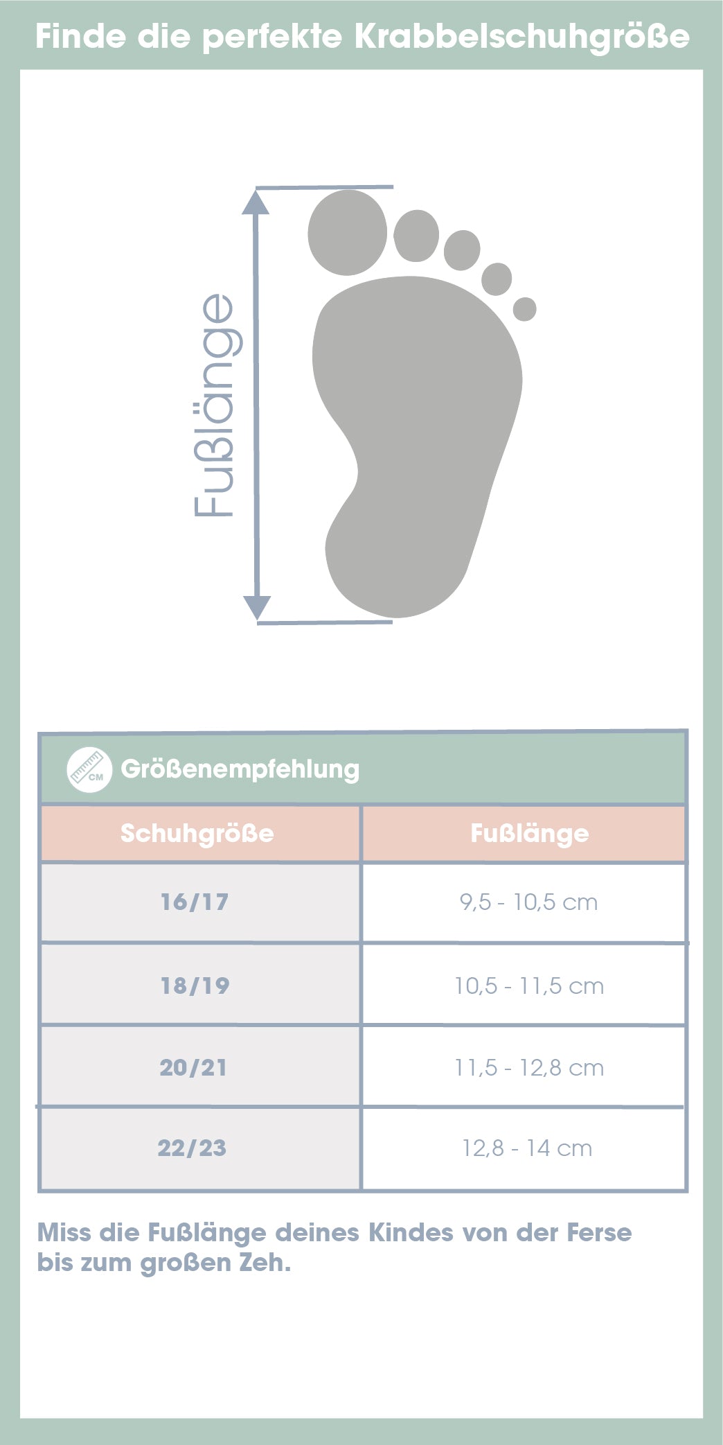 Durch Nutzung unserer Größentabelle erhältst Du unkompliziert und rasch die idealen Schuhe für Deinen kleinen Abenteurer. Gerade im Fall von Schuhen ist die passende Größe besonders wichtig, um ein behagliches Trageerlebnis zu gewährleisten. Die richtige Größe zu ermitteln, erfordert die präzise Messung der Füße Deines Kindes. Vermesse dazu die Länge seines Fußes (vom Fersenende bis zur Zehenspitze) und schaue anschließend in unsere Größentabelle, um die idealen Krabbelschuhe für Deinen kleinen Schatz zu ermitteln. Wenn Du wissen willst, wie Krabbelschuhe am besten sitzen sollten, dann empfehlen wir Dir unseren kurzen Blogbeitrag zu diesem Thema.
