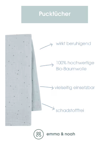 Unsere emma & noah premium Pucktücher sind mit 120x120 cm deutlich größer als gewöhnliche Puchtücher für Babys und bieten Deinem Baby dadurch mehr Sicherheit und Geborgenheit. Ein Pucktuch ist nämlich dazu gedacht, Dein Baby einzuwickeln und ihm so die vertraute Umgebung des Mutterleibs zu simulieren. Sie bestehen aus 100% Bio-Baumwolle und sind dadurch äußerst sanft zur zarten Babyhaut und zugleich noch sehr atmungsaktiv. Das ist besonders beim Pucken ein wichtiger Faktor, da das Baby eng mit einem Baby Pucktuch eingewickelt wird. Wie alle unsere Produkte bei emma & noah, sind auch unsere Pucktücher unabhängig von dem strengen OEKO TEX Standard 100 Siegel zertifiziert wurden. Das bedeutet, dass sie frei von Schadstoffen und somit unbedenklich für Deinen kleinen Schatz sind. Um das perfekte Baby Pucktuch zu entwickeln, haben wir eng mit Eltern und Hebammen zusammengearbeitet. Dadurch sind unsere wunderschönen Pucktücher entstanden. Aufgrund ihrer praktischen Größe können sie aber auch noch auf ganz andere Weisen im Alltag mit Baby eingesetzt werden. Sie können beispielsweise auch als dünne Babydecke zum Kuscheln verwendet werden, aber auch als Wickelunterlage, Spucktuch oder Sonnenschutz im Kinderwagen. Sollte das Pucktuch einmal verschmutzt werden, kann es ganz ohne Probleme in einer herkömmlichen Waschmaschine bei 40°C gereinigt werden und ist dadurch super schnell wieder einsatzbereit. Da kann man ja nur zugreifen, nicht wahr?