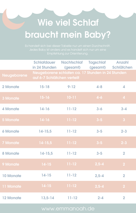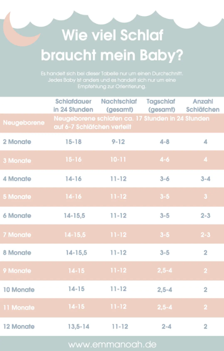 Nachfolgende haben wir eine kleine Schlaftabelle für Babys eingebunden. Was jedoch wichtig ist: Es handelt sich nur um Durchschnittswerte. Jedes Baby schläft anders und auch die Dauer unterscheidet sich dementsprechend.