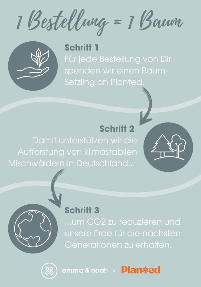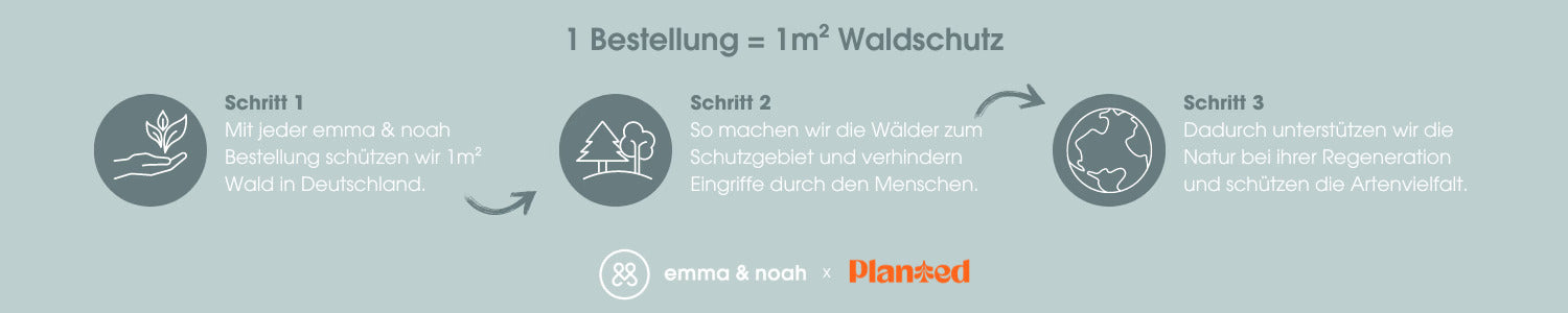 Mit Deiner Bestellung bei emma & noah sorgst Du dafür, dass 1m² Wald für ein gesamtes Jahr geschützt und Teil eines Naturschutzgebietes wird. So schenkst Du der Natur Zeit, um sich zu regenieren und gleichzeitig einen Lebensraum für viele Lebewesen zu bieten.