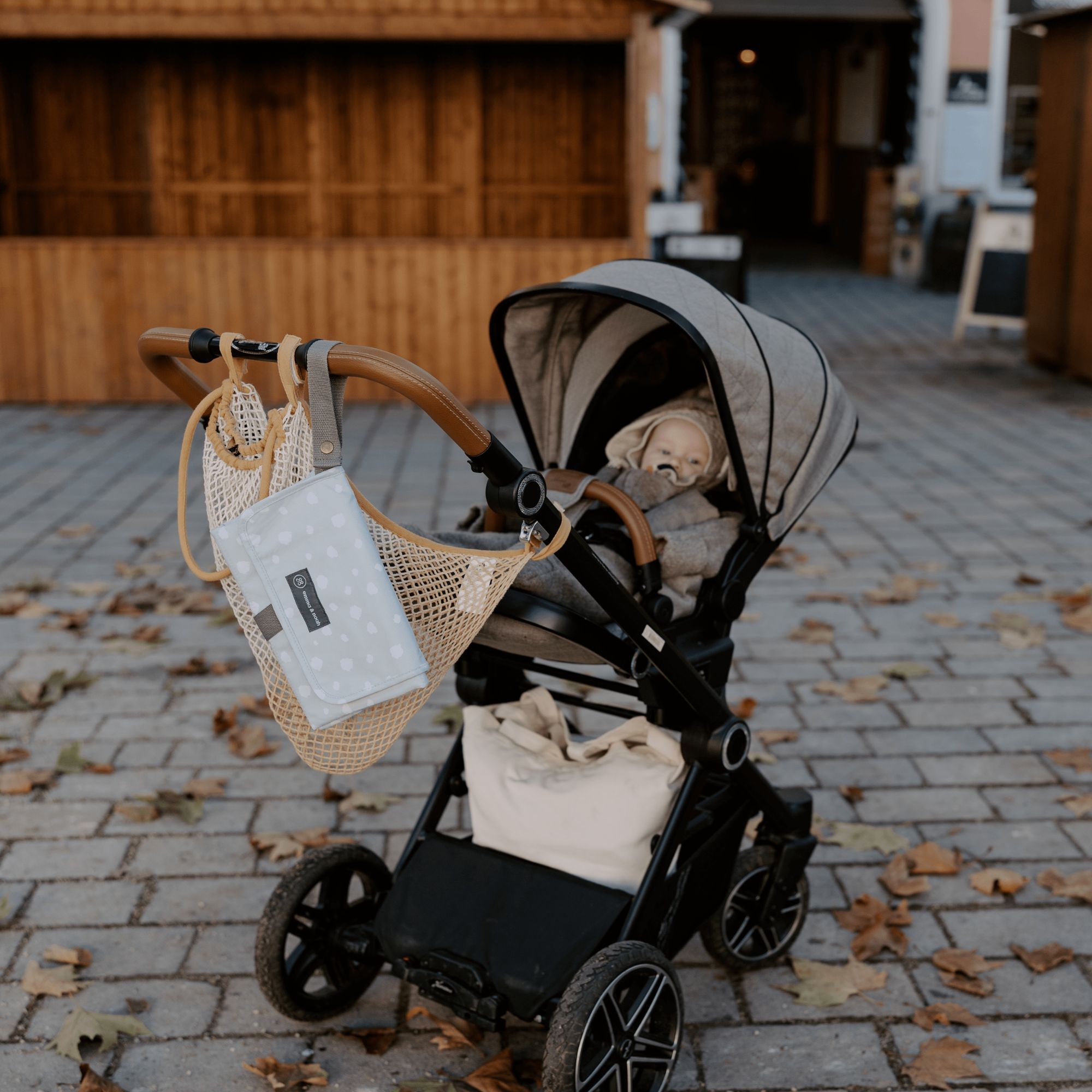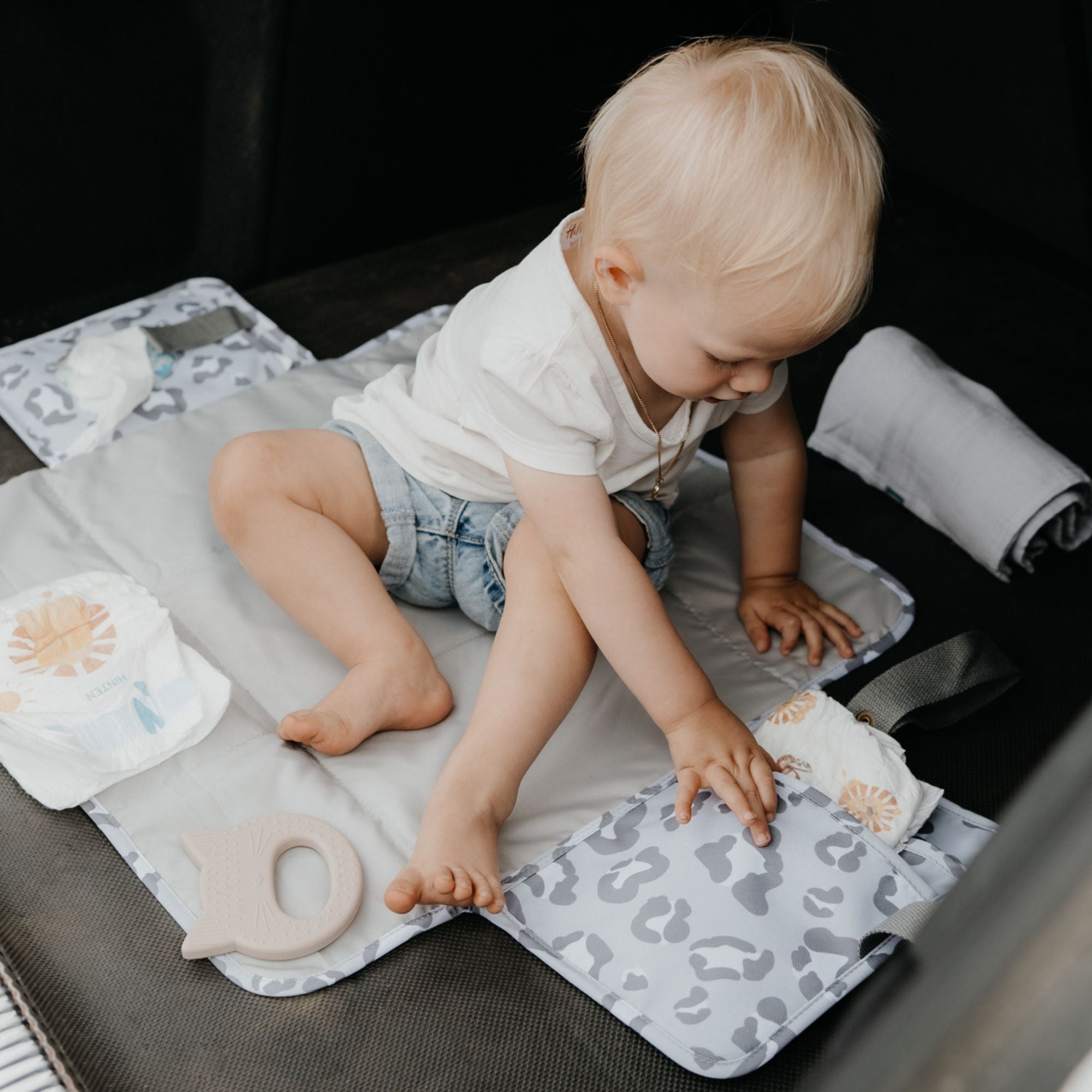 Unsere mobile Wickelunterlage lässt sich ganz bequem überall mit hinnehmen. Sie ist kompakt und bietet gleichzeitig ausreichend Stauraum für alles, was Du für das Wickeln unterwegs benötigst: Wndeln, Feuchttücher und Pflegeprodukte. Dank der praktischen Schlaufe kannst Du sie im Handumdrehen am Kinderwagen oder an Deinem Handgelenk befestigen. So ist sie jederzeit griffbereit, wenn Du sie benötigst.